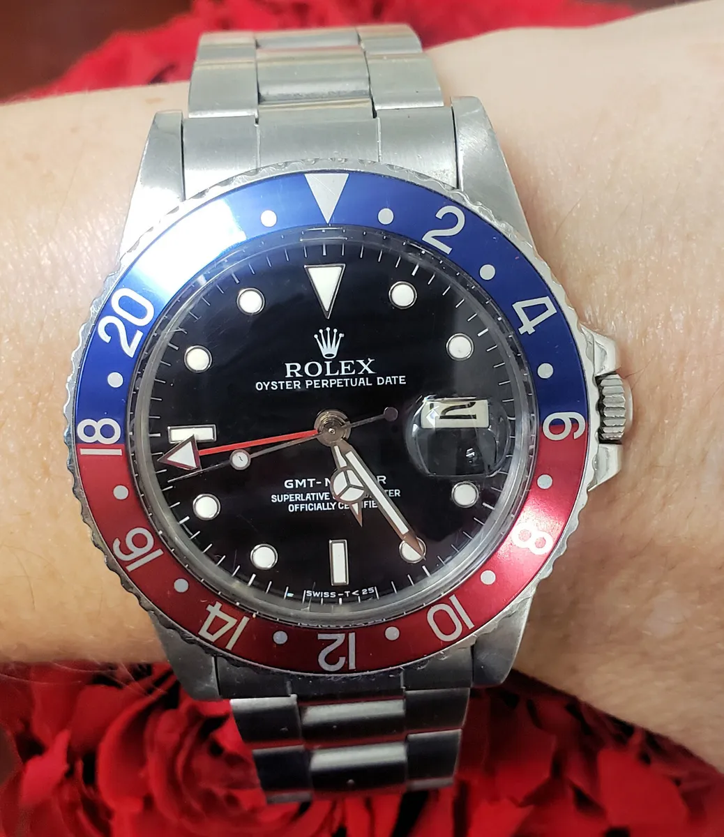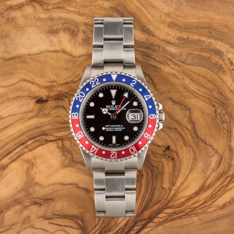 Bezel: Bidirectional rotating bezel with a special 24-hour blue and red "Pepsi" bezel insert.